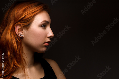 Closeup portrait of a red-haired female model on black background