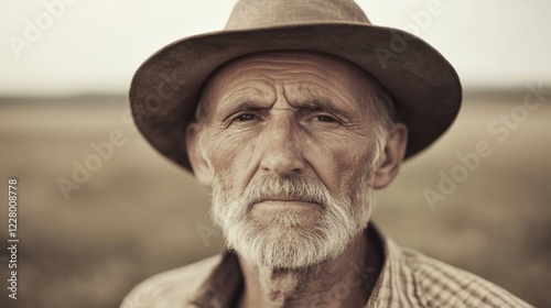 man, senior, old, elderly, person, face, portrait, head, hat, beard, grey, hair, expression, eye, wrinkle, skin, weathered, outdoors, field, background, nature, summer, day, light, shadow, serious, pensive, thoughtful, mature, age, wisdom, life, life events, human, male, farmer, grandfather, grandfather, adult, looking, stare, contemplative, calm, quiet, alone, lonely, countryside, rural, country