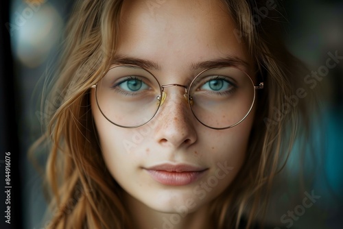 Close-up portrait of a serene and captivating young woman with clear eye contact, wearing stylish glasses and exuding confidence and beauty
