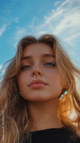 Close-up portrait of a serene young woman with golden blonde hair and captivating blue eyes, bathed in soft natural light against a clear blue sky, evoking a sense of tranquility and effortless beauty