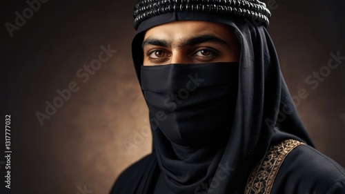 Close-up portrait of a sheikh in a black mask on a dark background, the photo exudes wealth and generosity, illustration