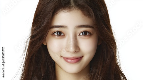 Close-Up Portrait of a Smiling Young Woman with Flowing Dark Hair and Natural Makeup Against a Plain Background