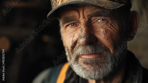 man, face, beard, weathered, old, grey, wrinkle, eye, blue, nose, mouth, skin, portrait, male, senior, expression, look, gaze, dirt, grimy, rough, tough, work, labor, hard, working, serious, shadow, light, sharpened, sharp, texture, detail, contrast, human, person, grit, gritty, authentic, real, genuine, individual