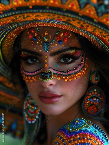 Close-up portrait of a woman adorned with colorful, intricate beadwork on her face and headpiece, showcasing vibrant makeup and detailed accessories. Mexico. Cinco de Mayo