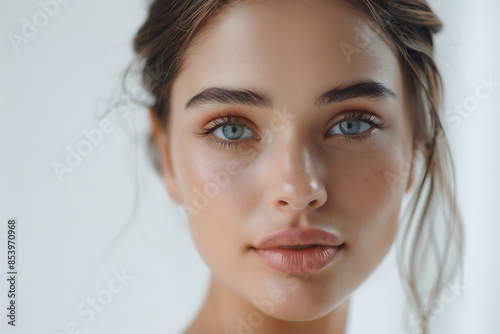 Close-up portrait of a woman with flawless skin, showcasing her natural beauty in a stunning beauty concept.