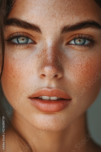 Close-up portrait of a woman with freckles on her face