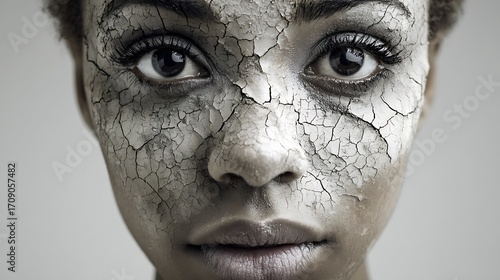 skin, dry, cracked, face, beauty, problem, cosmetic, skincare, make-up, mask, female, woman, portrait, closeup, texture, damaged, vulnerable, fragile, emotion, stress, health, medicals, dermatology, human, abstract, concept, art, fine art, unique, expressive, dramatic, dark, light, contrast, eye, lip, care, disease, ageing, despair, sorrowful, problem, mental health, anxiety