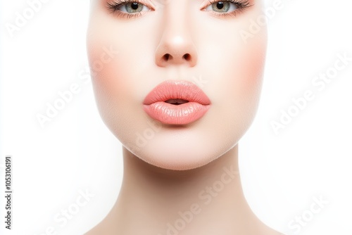Close-up portrait of a woman with soft makeup against a white background, emphasizing beauty and elegance.