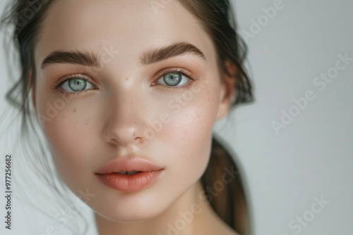 Close-up portrait of a woman's face featuring piercing blue eyes