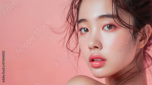 Close-up portrait of a young Asian woman with flawless skin, natural makeup, and captivating eyes on pink background