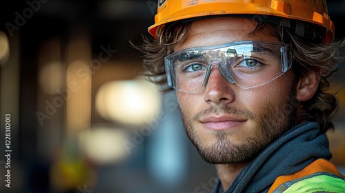 Close-up portrait of a young construction worker wearing a hard hat and safety glasses, looking directly at the camera with a serious expression.