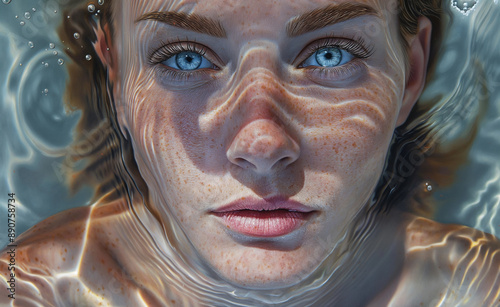 Close-up portrait of a young girl with blue eyes and freckles submerged in water.