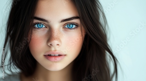 girl, young, blue eye, dark hair, portrait, closeup, beauty, light, background, confident, glamour, attractive, female, face, skin, natural, serene, expressive, fashion, elegant, youth, fresh, stylish, clean, minimal, modern, soft, bright, aesthetic, glowing, clear, innocent, pretty, model, simplicity, poise, charming, pure, delicate, stunning, smooth, hair, simple