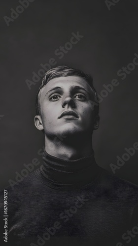 stunning, attractive, expression, colourful, closeup, fashion, decorative, marvellously, sharpened, detail, texture, calm, stylish, gorgeous, elegant, vibrant, shirt, confident, thoughtful, pensive, clothing, modern, professional, amazing, head, young, bright, model, face, seriousness, upward, black, creative, male, portrait, man, light, dark, shadow, detail, white, neck, hair, fantastic, greyscale, beautiful, serious, looking