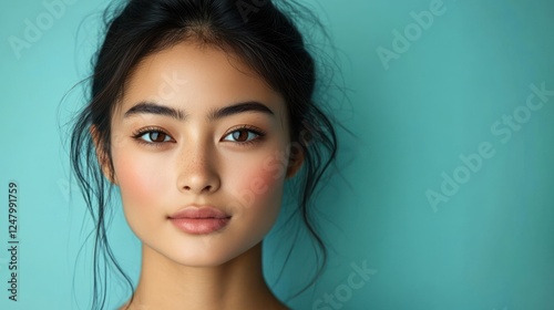 Close-up portrait of a young woman with clear skin and dark hair in a bun, against a teal background.