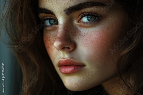 portrait, woman, face, freckle, eye, blue, skin, young, beauty, model, girl, female, closeup, looking, gaze, expression, natural, soft, make-up, eyebrow, lip, hair, brown, photo, studio, fashion, art, photo, lighting, sharpened, sharp, detail, light, shadow, colours, texture, human