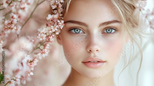 woman, girl, face, portrait, beauty, model, eye, blue, hair, blond, skin, flower, pink, blossom, spring, delicate, pretty, young, fresh, healthy, natural, make-up, gentle, soft, romantic, serene, elegant, flawless, clear, bright, innocent, pure, cheerful, calm, lovely, dreamy, feminine, tender, expression, gaze, attractive, smile, lip