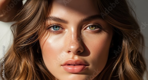 Close-up portrait of a young woman with luminous skin and captivating blue-green eyes. Her wavy brown hair frames her face with golden highlights. Perfect for beauty campaigns.