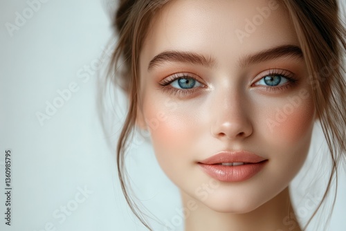 portrait, beauty, female, model, skincare, natural makeup, blue eye, missy, hair, closeup, smiling, fresh, elegance, cosmetic, fashion, studio shot, light background, aesthetic, happiness, confidence, calmness, softness, youth, lifestyle, glamour, facial expression, reddening, alluring, cute, serene, radiant, stylish, artistic, charming, head shot, allure, feminine, relaxed, professional