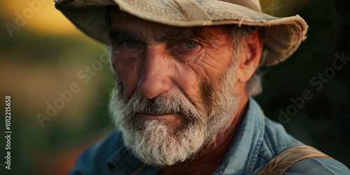 farmer, male, elderly, beard, hat, closeup, portrait, agriculture, rural, outdoors, natural light, serious, weathered, face, wrinkle, farming, mature, traditional, lifestyle, rustic, countryside, occupation, work, autumn, harvest, field, crop, labor, hard-working, nature, old, man, rugged, life events, agricultural, daytime, focused, staring, denim, solitude, country, sunlit, real people, authentic, expression, sunlight, determination