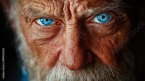 Close-up portrait of an old man with wrinkled face and piercing blue eyes