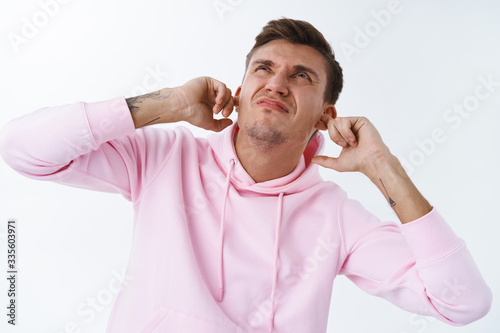 Close-up portrait of annoyed and disturbed blond man in pink hoodie cant work from home during quarantine covid19 cause neighbour upstairs being too loud, shut ears not hear noisy music