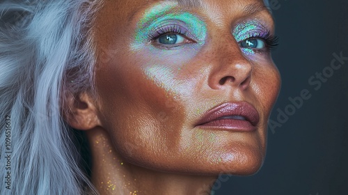 Close-up portrait of beautiful mature woman face with brightly glitter make up and silver hair
