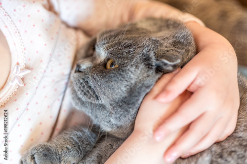 Close-up portrait of cat being hugged by child. Kitten patience. Best friends. Pet care