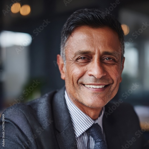 closeup portrait of confident mature indian or hispanic businessman smiling in office setting