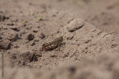 Close-up portrait of grey Woodland Grasshopper on ground. This grasshopper is present in most of Europe, in eastern Palearctic ecozone, in North Africa and in the Near East