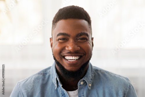 Closeup portrait of handsome millennial african american guy with happy smile on face, copy space