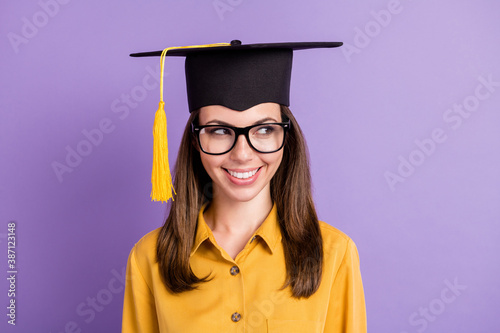 Close-up portrait of her she attractive cheerful cheery knowledgeable girl wearing graduate cap looking aside copy space isolated on bright vivid shine vibrant lilac violet color background