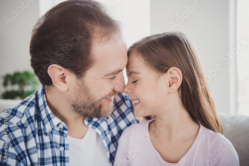 Close-up portrait of his he her she nice-looking cute sweet attractive cheerful pre-teen girl handsome bearded dad daddy trust support tenderness in light white interior room indoors