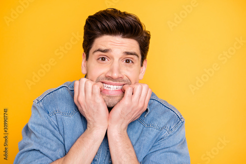 Close-up portrait of his he nice attractive handsome funky guy biting nails horrified horrible news isolated over bright vivid shine vibrant yellow color background