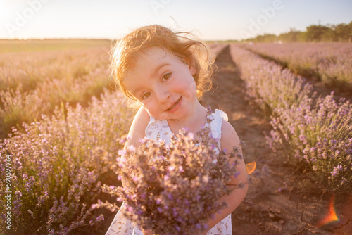 Close-up portrait of little girl in flower dress holding bouquet with purple lavender at sunset. Child stands among the rows in field. Walk in countryside. Allergy concept. Natural products, perfumery
