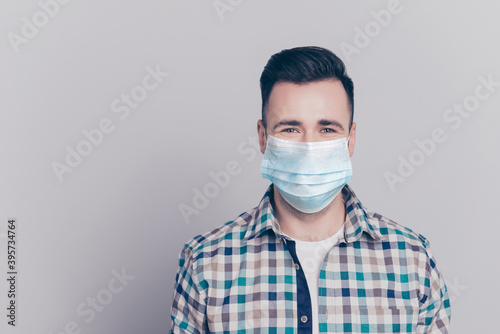 Close-up portrait of nice content guy wearing safety gauze mask mers cov prevention copy space isolated over grey background