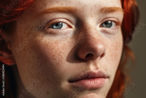 redhead, sex, portrait, androgynous, woman, transgender, closeup, face, red hair, freckle, individuality, blue eye, youth, young, person, 1, studio, beauty, people, eye, hoyden, skin, serious, confident, authentic, ai, generative, closeup, closeup, eye