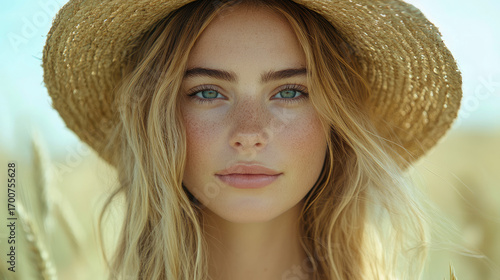 Close-up portrait of serene young woman with blonde hair, freckles, and captivating blue-green eyes, wearing straw hat in sun-kissed natural field