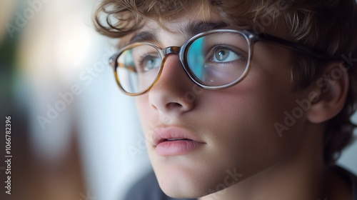 Close-up portrait of serious teenage boy wearing glasses gazing upward in contemplative expression with soft natural lighting, copy space
