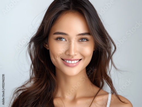 closeup portrait of smiling young asian indian woman with long hair clean teeth isolated on white background dental beauty skin care commercial photo
