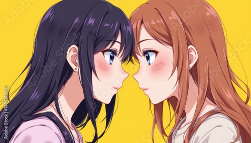 anime, illustration, character, friendship, interaction, emotion, intimacy, expression, face, colours, yellow, background, young, female, detailed, art, vibrant, closeup, creative, cute, stylised, playful, cheerful, romantic, youthful, dynamic, eye contact, affection