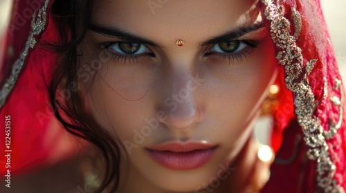woman, portrait, veil, jewellery, beauty, ethnicity, gaze, red, closeup, make-up, fashion, accessory, culture, ethnic, eye, expression, artistic, skin, hair, long hair, lip, adornment, ornate, detail, elegance, serene, emotion, noble, light, smooth, blurred background, traditional, celebration, lifestyle, grace, nature, femininity, charme, mystery, refinement, texture, artistry, profile, aesthetic