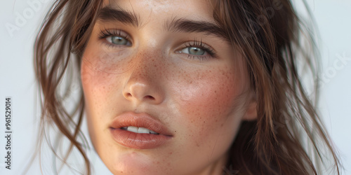 Close-Up Portrait of Woman with Natural Freckles and Minimal Makeup, Soft Lighting Highlighting Woman’s Freckled Skin and Natural Look