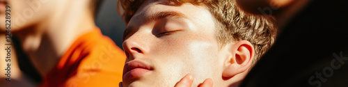young men, freckle, closeup, portrait, face, eyes closed, hand, cheek, touch, light, skin, hair, blonde hair, background, person, shoulder, sunlight, male, model, youth, close, detailed, texture, feature