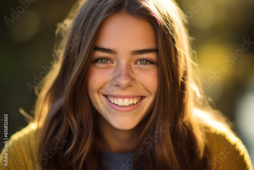 Close-up portrait photography highlighting the radiant smile and natural beauty of a happy individual. Generative AI