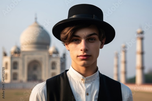 Close-up portrait photography of a blissful boy in her 20s wearing a formal top hat in front of the taj mahal in agra india. With generative AI technology