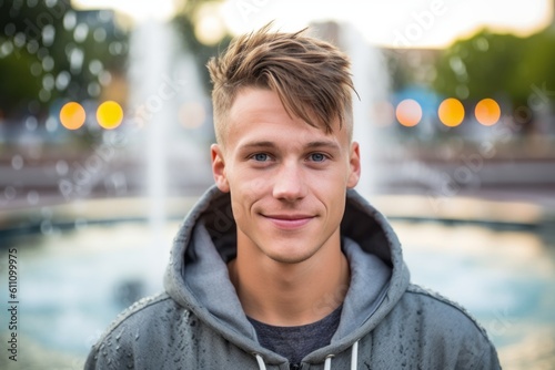 Close-up portrait photography of a glad boy in his 30s wearing a cozy zip-up hoodie against a vibrant city fountain background. With generative AI technology
