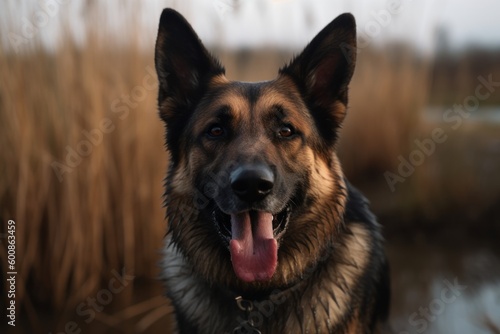 Close-up portrait photography of a happy german shepherd playing with a tennis ball against wetlands and marshes background. With generative AI technology