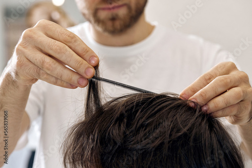 close-up, professional male hairstylist combing young customer's hair