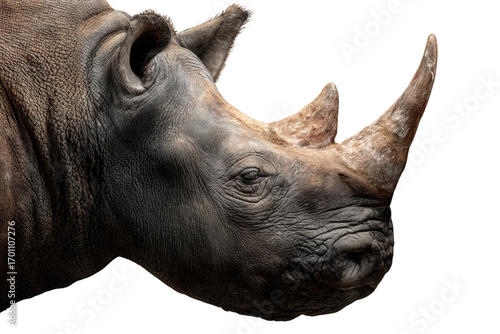 Close-up profile of a rhinoceros, showcasing its thick skin and prominent horns against a transparent background. background removed